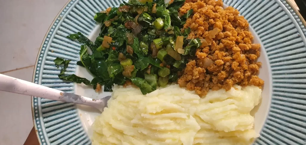 Esse almoço vegano é uma das minhas receitas preferidas para o dia a dia. Prático, acessível e cheio de sabor, ele combina purê de batatas com proteína de soja bem temperada e couve refogada — direto da horta da minha mãe, o que traz ainda mais carinho e frescor ao prato.